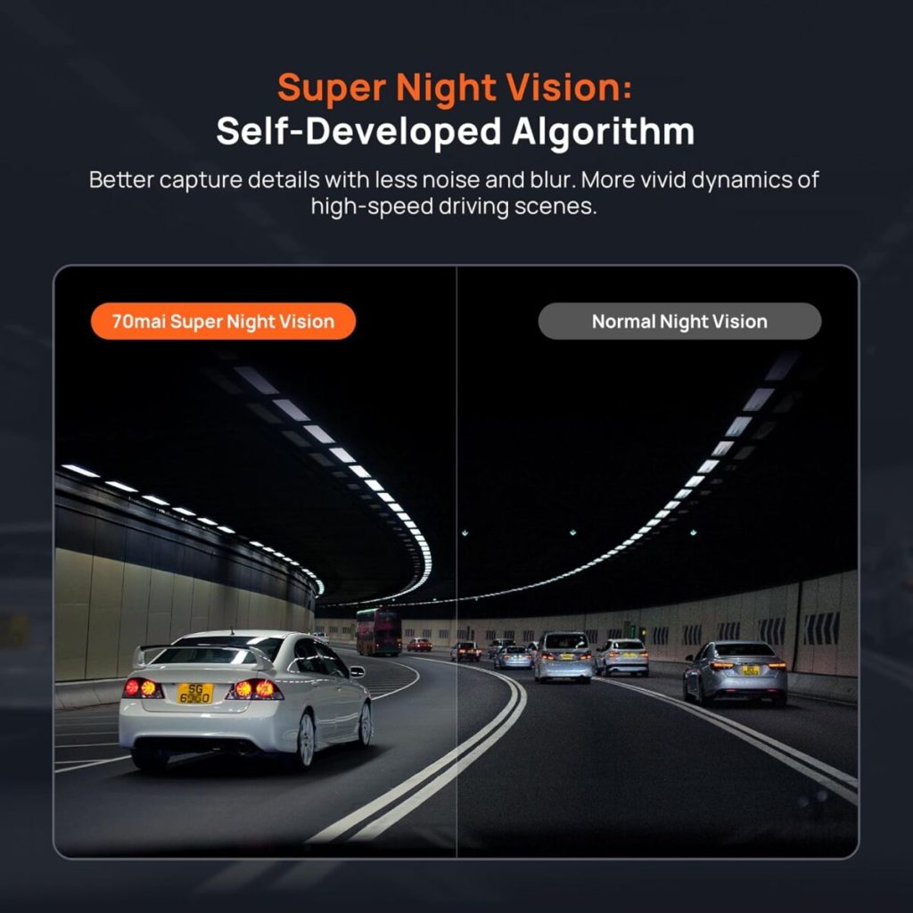 Εξοπλισμένη με μεγάλο διάφραγμα f/1.55 και τεχνολογία HDR και στις δύο κάμερες, η dash cam αποδίδει έως και 16 φορές περισσότερη λεπτομέρεια σε σύγκριση με τα τυπικά μοντέλα. Εστιάζει στην αποτύπωση λεπτομερειών σε συνθήκες εξαιρετικά χαμηλού φωτισμού, διασφαλίζοντας καθαρές εικόνες για ασφαλέστερη νυχτερινή οδήγηση.
