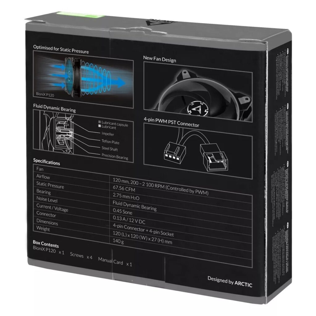 Τα Fans της Arctic υπόσχονται μεγάλη διάρκεια ζωής, μέγιστη απόδοση και μειωμένο θόρυβο. Το Fluid Dynamic Bearing έρχεται με oil capsule ώστε να αποφευχθεί οποιαδήποτε διαρροή λιπαντικού, έτσι καταφέρνει να είναι αθόρυβο με σημαντικά υψηλότερη διάρκεια ζωή.